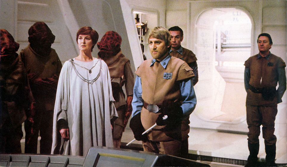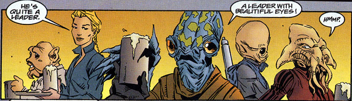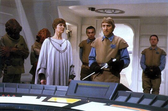The fact that the human rebels in Return of the Jedi adopted what appear to be Calamarianised uniforms and insignia is probably and understated sign of the aliens' growing influence within the Alliance. (Especially in the aftermath of the rout of former-Alderaanian forces on Hoth in The Empire Strikes Back.) This fashion is almost certainly Calamarian, rather than being derived from another rebel group, because Mon Calamari civilians wore similar dress years before contact with interstellar society [see X-Wing Rogue Squadron: Requiem for a Rogue].