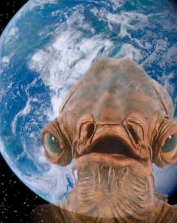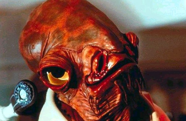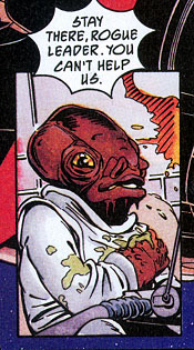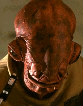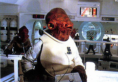 Image of a Mon Calamari soldier. This is not, as was mistakenly reported in some published sources, Admiral Ackbar. Ackbar's eyes are a nearly uniform yellow-gold; this individual has more reddish streaks in his eyes.