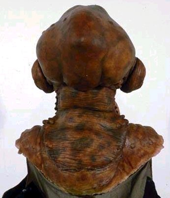 Profile and rear views of the Admiral Ackbar mask shows the valve-like aperture behind the eye clearly. Also note the muscular sheath of flesh extending below the dome; it may pump water through cranial gills, if they exist.