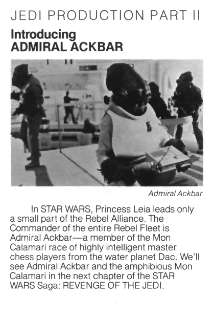 Aside from the Ewoks, the Mon Calamari are the most extensively represented non-human species in the STAR WARS. (Jawas don't count because we don't see any parts of their bodies.) The total number of distinct Calamarians seen in Return of the Jedi is at least eight distinct individuals: Admiral Ackbar; three of four bridge crewmen; one trooper; and three dignitaries (of whom at least two were in civilian dress). Since the Mon Calamari are so numerous onscreen, they are a potentially fruitful topic of investigation. Unlike species which have thusfar been represented by single members, it is possible to compare different individuals and thus to distinguish the general traits of the species from personal characteristics.