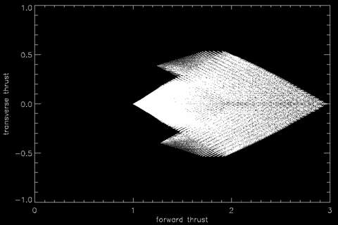Taken together, the zero-torque condition and the deflection and thrust constraints of individual engines limit the attainable (vector sum) thrust in longitudinal and transverse directions. These engine configurations are mapped in the diagram below. It is assumed that at least one of the engines is at maximum thrust. If the destroyer's maximum straight-line acceleration is 3.0 units, then its maximum sideways acceleration is about 0.55. This transverse acceleration is only achievable while there is a forward acceleration of about 1.7.