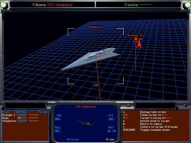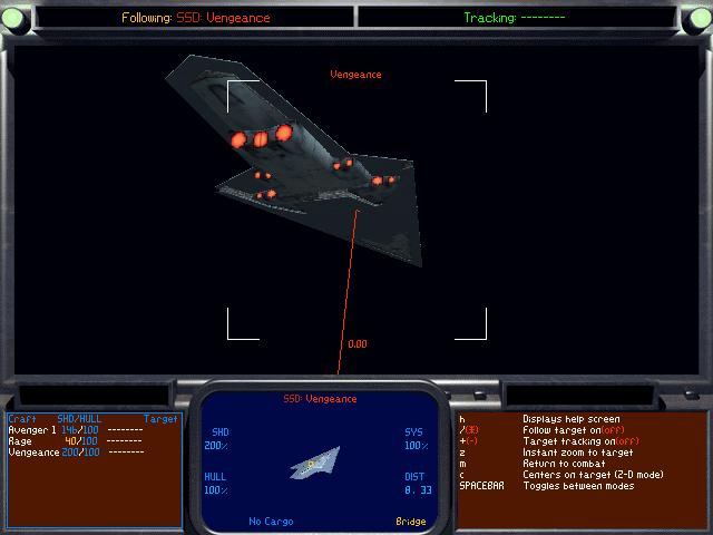 Screenshots from Balance of Power. The Vengenace is generally similar in shape to the Executor; it seems to have been intended as a ship of that class. Viewed beside an ISD at the same height, it seems to be about five miles long. (In the comparison image, it's roughly 4.95 miles. This scaling is, of course, irreconcilable with The Empire Strikes Back and Return of the Jedi.) [J.Helper]