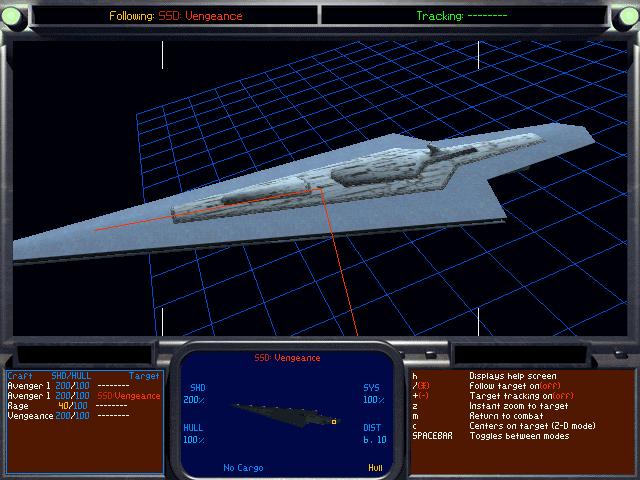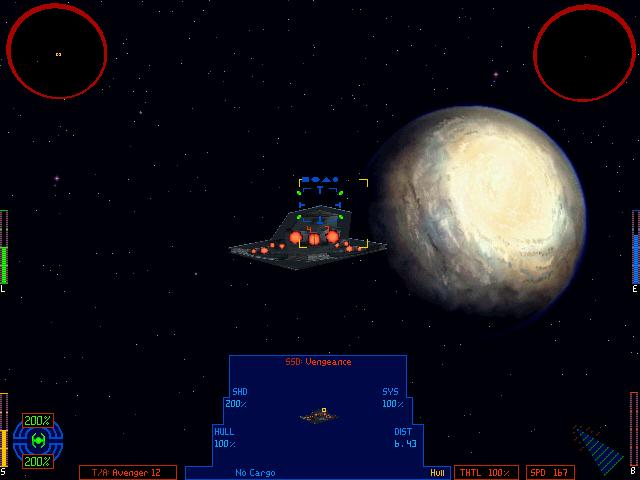 An upgrade to LucasArts' X-Wing vs TIE Fighter commputer game, set before the Battle of Endor, entitled Balance of Power, includes a “Super Star Destroyer” as a target. This ship is called Vengeance (making it at least the third vessel with that name). It is commanded by Admiral Senn, and it is stationed in Airam sector. It matches neither the Executor's features exactly, nor the mythical five-mile ship from WEG. The shape resembles the Executor better than the RPG figment, but the statistics displayed within the game indicate the usual erroneous 8km length. [ Refer to this screenshot].