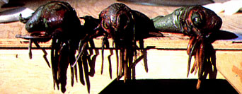 The aquatic creatures favoured as a live snack by Jabba the Hutt are about twenty centimetres long. They consist of a fleshy olive-green elongated abdomen, two muscular toad-like hind-legs, a red-brown head and approximately ten tentacles of length fifteen centimetres and one centimetre thickness. The tentacles do not all converge at one point, but are paired. The mouthparts are anterior to the frontmost of tentacles.