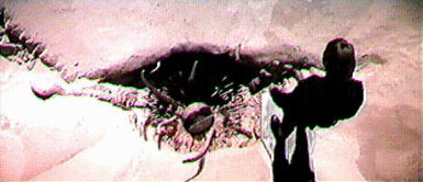 A giant space slug lunges from its tunnel in pursuit of a starship which has been irritating its interior tissues.