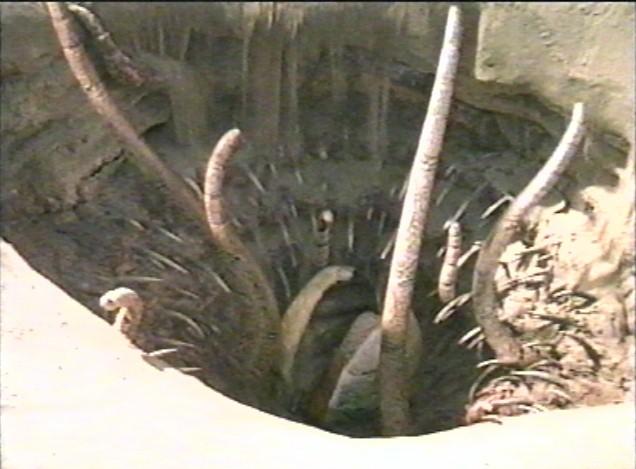 Tentacles: have a Strength of 6D, reach up to four metres outside pit; do not cause damage, but victims must make a successful opposed Strength roll to escape.