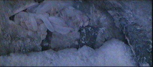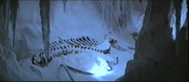 Skeleton of a tauntaun lies in the lair of a wampa. Note the thickness of the vertebrae. Long ventral spines may be attachment points for powerful musculature. The absence of visible ribs may have more to do with the eating habits of the wampa than with tauntaun anatomy.