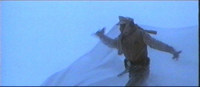 A domesticated female tauntaun carrying a rebel officer races over the wastes of Hoth.