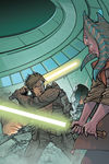 Once the two get inside the storage level of the tower, Zayne unlocks the vent door as planned and they wait for Raana Tey to enter. But Shel also has a plan of her own which Raana Tey secretly gave her last issue. While Zayne is reminescing about his lost friend Shad, Shel picks up one of the Padawan's lightsabers off a rack in which she is supposed to insert a crystal that Raana Tey gave her. But she hesitates and Raana arrives as Zayne is leaving the room to complete his mission to confirm the presence of Cassus Fett. He goes upstairs to the Jedi Council chamber where Fett is supposed to be located, only to find it empty. A lone Mandalorian explains to Zayne, which he mistakes for one of his kind, that Mandalorians are nomads and never stay in one place for long. So the whole mission is a bust; Cassus Fett is not in the tower. Even worse, Zayne learns that the Mandalorian leader has found the Resistance's secret base and is presently planning an assault.