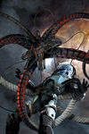 The reason for Golliard's court-martial is because he was unsuccesful in re-capturing the slaves that were rescued from the Crucible's comet-mining client which Zayne and Jarael rescued. The was the escape is executed is nothing short of formidable. Once the spacesuited slaves are all cramped aboard the ship (an opration started last issue), Jarael has to be freed from one of the skyreaper drones that are dispatch to retake the escapees. Zayne manages to do that with help from Rohlan. Once everyone is aboard (to Gryph's dismay), they now have to escape the comet's gravity field and go into hyperspace while fighting off the heavily-armed Gladiator. First off, it is established that the Hot Prospect only has one fixed cannon. But it is a mining ship. So the crew use every feature and cargo from the ship that can cause damage. First, they send a drill to dig through the Gladiator's hull; then they throw some explosive charges; then they spray the skreapers with xenoboric acid with a hose; then they shatter the viewport with a big crane hook; then when the two ships are hooked, they use the big centrifuge (that Gryph was harvesting crystals with) to make the Hot Prospect spin while Jarael shoots the ship's cannon. Pretty daring escape.