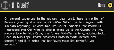 What I found lacking in the movie, but found throughout the multiple drafts in the Insiders' Guide were the many references to the prejudices of the Gungans and humans. There is a cursory level still evident in the movie, but in the Insider's Guide however, Amidala tries to stop Jar Jar from boarding her ship. (Scene 22 - racial tension button) This is a great set up for the animosity between the two cultures, and why they won't fight together. This is also the perfect foundation for Palpatine's eventual human superiority of the Empire, alien extermination and enslavement. He's from a planet that treats aliens as inferiors, a feeling he promotes and builds into the Empire. While the celebrated point of Star Wars has always been lo-tech overcoming hi-tech, the other common ground is racism. The rebels won because they united with aliens. Amidala won because she overcame her prejudices, bowed to Boss Nass, and said the humans of Naboo are not greater than the Gungans.