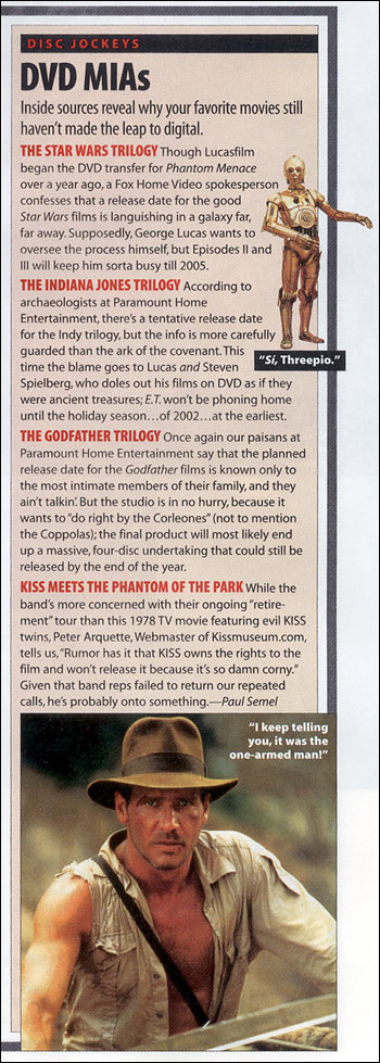 Lou mentions a brief note in Maxim Magazine, a print magazine that always seems to reference Star Wars at least once an issue. Next month (July) Maxim lists Star Wars Trilogy as top DVD MIA... Missing in Action ... along side The Indiana Jones Trilogy. Of course, Issue 43 went to press some time ago no doubt, and they were unaware of the pending Episode I announcement. Of course, Indiana Jones is still missing in action, and hopefully we'll have word on that soon as well.