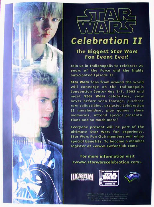 Join us in Indianapolis to celebrate 25 years of the Force and the highly anticipated Episode II. Star Wars fans from around the world will converge on the Indianapolis convention center, May 3rd through 5th, 2002, and meet SW Celebrities, view never before seen footage, purchase rare collectibles, exclusive Celebration II merchandise, play games, share memories, attend special presentations and so much more. Everyone present will be part of the ultimate SW fan experience.