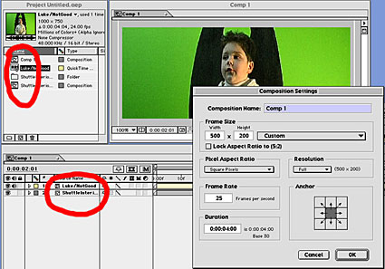 Step 1. First you need to set up your composition settings (pictured above) and pull in your footage. In this case the footage is the Shuttle Background (which you will see later) and the Luke/Greenscreen footage. The Luke footage needs to be placed above the background. Hopefully you know how to do this part, if not, we could be in trouble later on.
