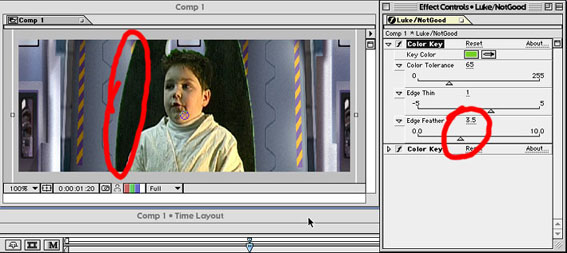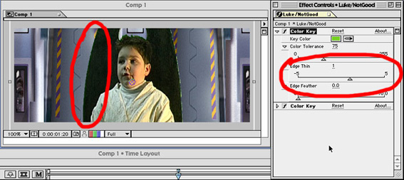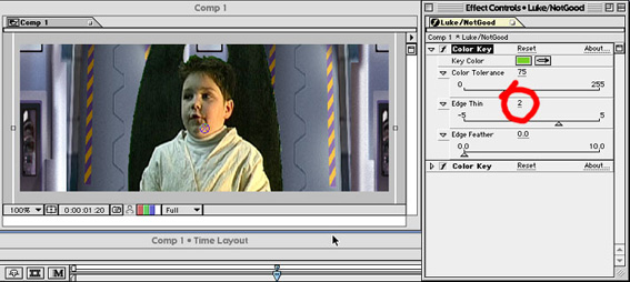 Step 7: To remove this we need to use the other tools in our Color Key pallette. First slide the 'Edge thin' to plus one. This makes the green on the left hand side begin to disappear...
