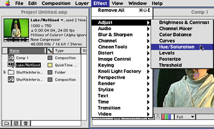 Step 13: We're in the home straight now. We have our three layers (two keyed & one background) and we are pretty well finished, but there is still a vague green glow around the edge of your subject, caused by light spilling onto your subject from your greenscreen. Let's get rid of that. Click on the greenscreen layer and go to EFFECT > ADJUST > SATURATION. In the 'effect control' palette, pull down the menu next to channel control to make 'greens' active (if you where using a bluescreen you would of course highlight 'blues)' Now just reduce the Saturation on this channel until the green spill has vanished, also mess around with the 'Green Lightness' slider and see what gives you the best results.