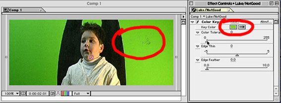 Step 2: Making sure the greenscreen layer is selected in your timeline (circled) go to EFFECT> KEYING > COLOR KEY. A new window will pop up showing you the Color Key attributes.