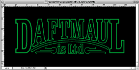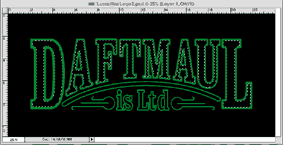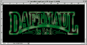 Make a new layer and fill this larger selection with black, once more click on expand and follow the same proceedure. Make another layer and fill that with your green colour. Postition the layers with this new layer on the bottom, on top of which is your black layer, on top of which is your original logo. If you've followed this (which isn't easy) it should now look something like the one above (minus the shading, which comes next).