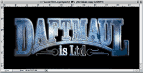 I created a texture called aluminum (supplied at the bottom of this page) and overlayed it onto another layer of the newly created 'before logo' Then again using the trusty magic wand, pick up all of the black APART from the area inside the main letters, invert this selection and then press delete. You should end up with a logo that looks something like this.