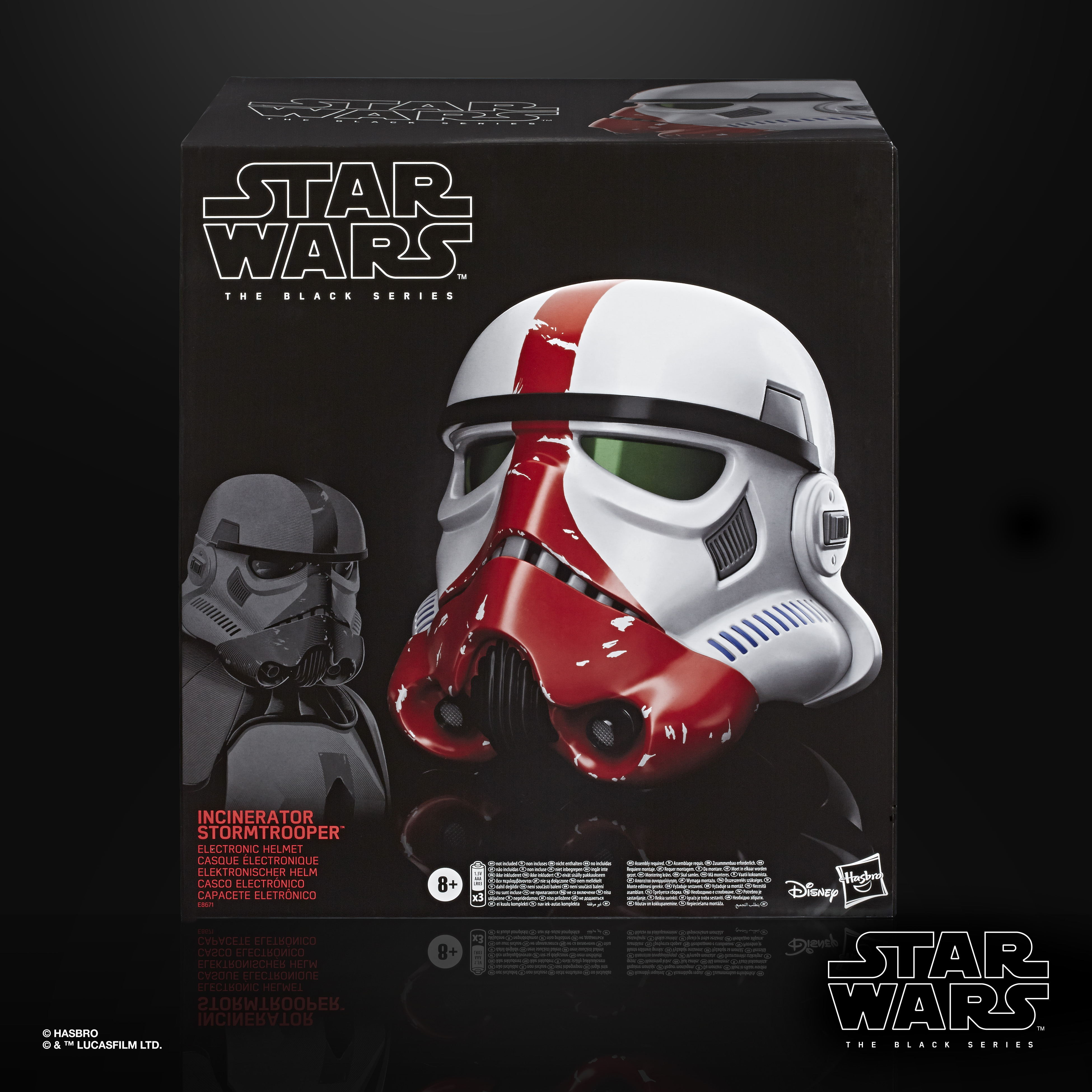 Fans and collectors can imagine scenes from the STAR WARS Galaxy with this STAR WARS: THE BLACK SERIES INCINERATOR STORMTROOPER PREMIUM ELECTRONIC HELMET, inspired by THE MANDALORIAN live-action TV series on Disney Plus. With the press of a button, fans and collectors can distort their voice to sound like that of an INCINERATOR STORMTROOPER. Featuring highly detailed deco, TV series-inspired design, interior padding, adjustable fit, and an electronic voice changer, this helmet is a great addition to any STAR WARS fan’s collection. Requires 3 1.5V AAA batteries, not included. Available as a Fan Channel exclusive.