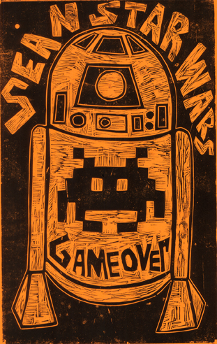 Featuring famed pop expressionist woodcut artist Sean Starwars, MAY THE 4TH BE WITH YOU will include a Star Wars costume contest, games, screen-printing, puppets, a comedy show, and balloon characters! Coagula will be decked out floor-to-ceiling with the eclectic work of Starwars, who is a member of the legendary Outlaw Printmakers. (He is such a big fan of the Star Wars films that he legally changed his name!) Currently, Starwars is embroiled in his most challenging project to date: One Woodcut A Week -- FOR LIFE. His life-long love of Mountain Dew should provide plenty of fuel. He will be doing screen-printing live at the exhibit, as well as signing any purchases made that day.