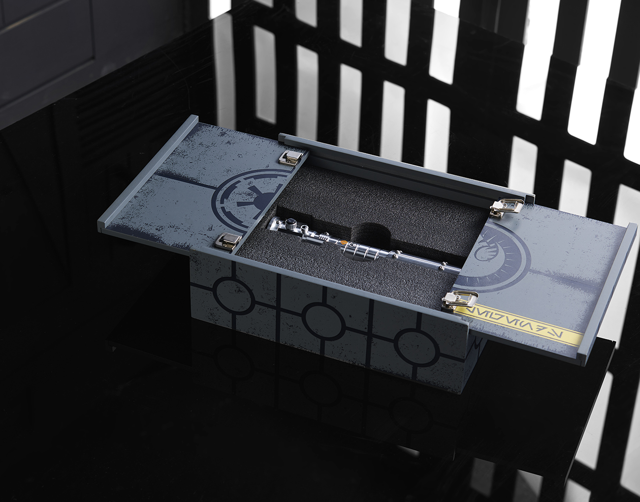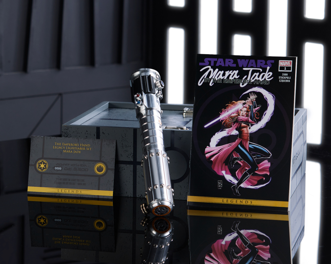 The set includes the Legacy Lightsaber Hilt, a limited edition Star Wars: Mara Jade - By The Emperor’s Hand #1 comic book, an individually numbered insert, and a wooden box with sliding doors. The lightsaber will glow purple when a Legacy Lightsaber Blade is attached (sold separately).