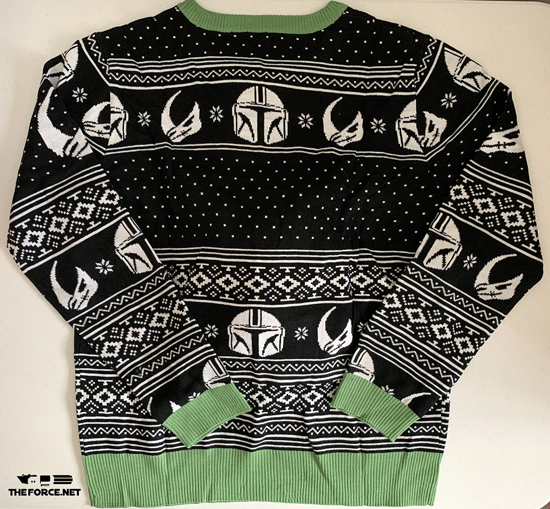 We popped open the bag and removed the sweater. It has a nice weight to it and feels anything but cheap. The stitching is well done and this isn't one of those super itchy feeling articles of clothing that sweaters are known to be. The graphics are straight out of The Mandalorian featuring both a Mandalorian helmet and a Mudhorn skull pattern.