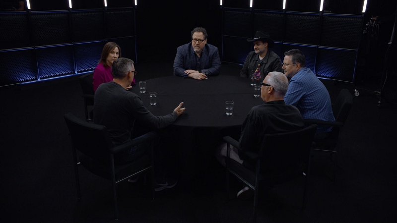 Clockwise, from center: Jon Favreau, Dave Filoni, John Knoll, Hal Hickel, Richard Bluff, Kathleen Kennedy.