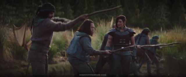 One particular moment that I think does an effective job of showing this distinct feel, is Cara and the Mandalorian training the villagers to fight the raiders.