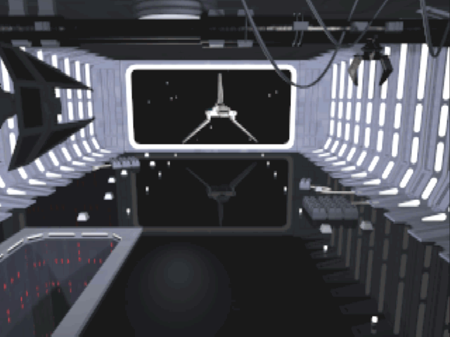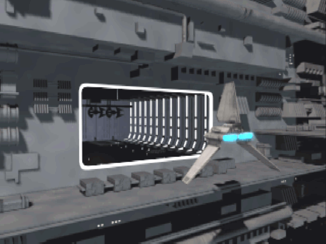 An important Imperial officer arrives at a fleet in Rebellion. The location of the hangar is uncertain, but it is important to note that no other part of the ship is visible beyond the hangar mouth. [Rebellion computer game]