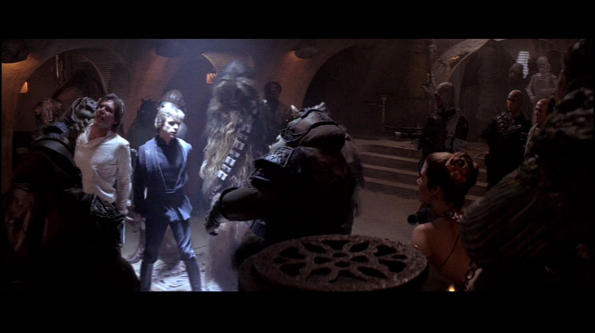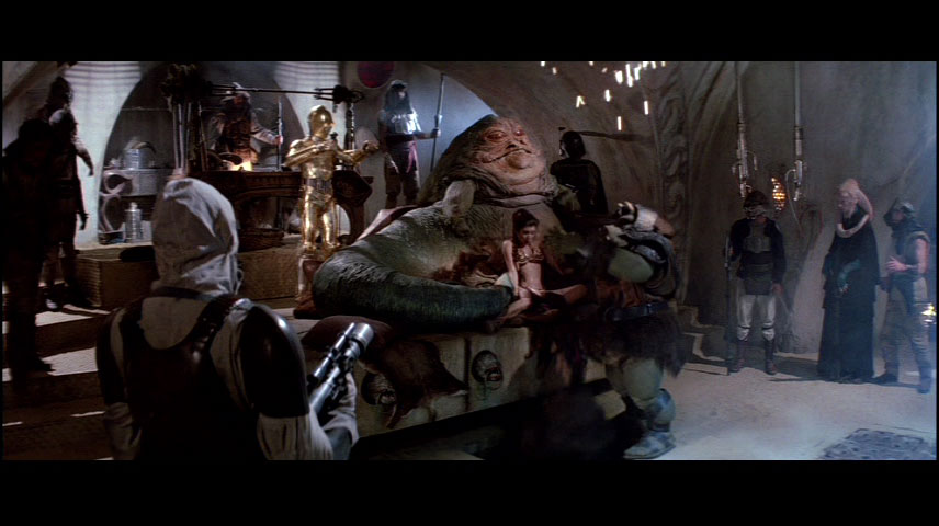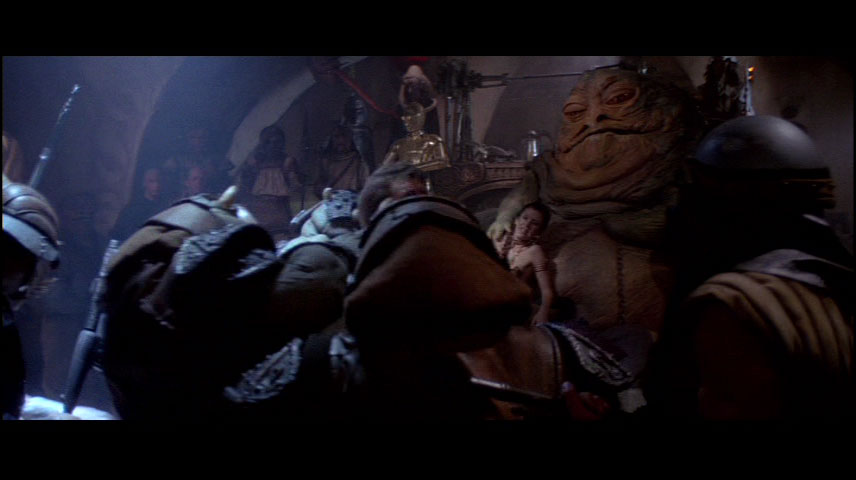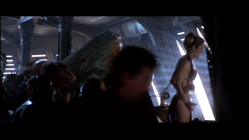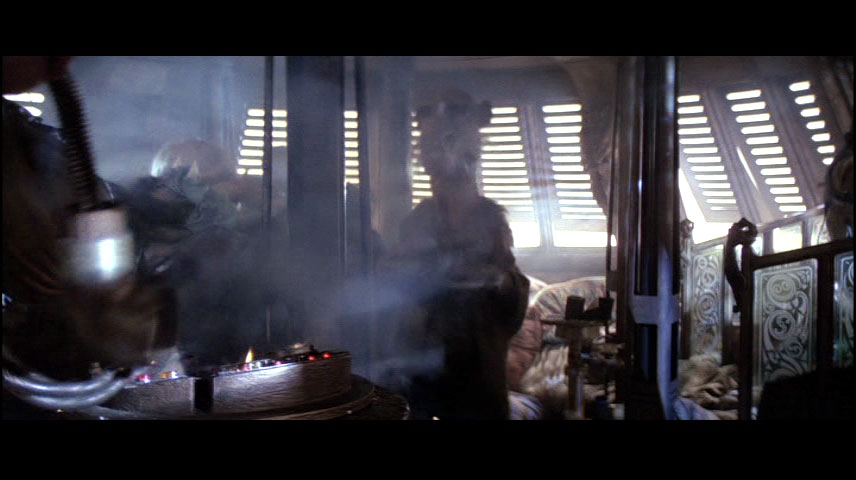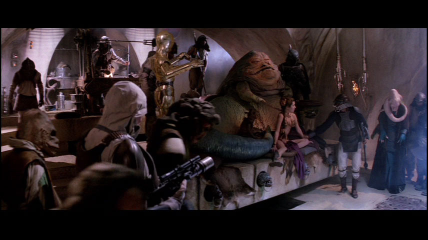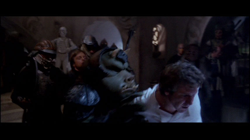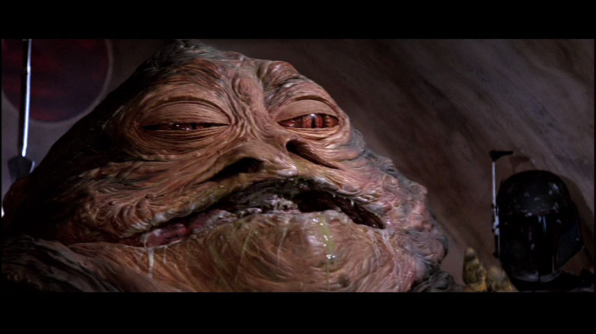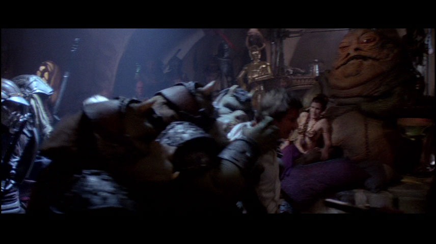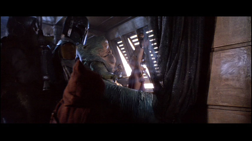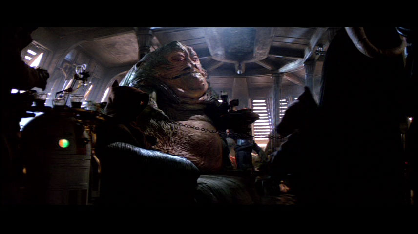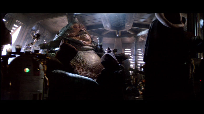 Infamous mercenary clad in Mandalorian armour moves around the throne room a great deal. At Jabba's right hand during Skywalker's arrival. At Jabba's left when Jabba' passed sentence. |