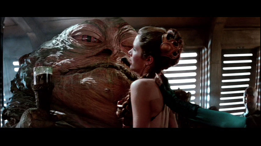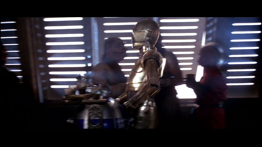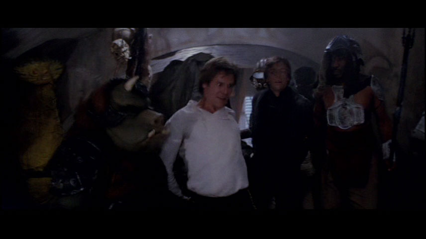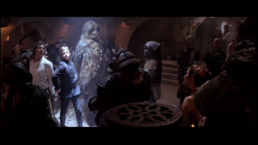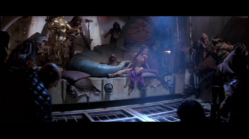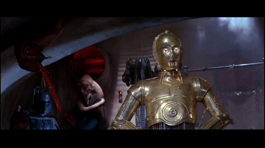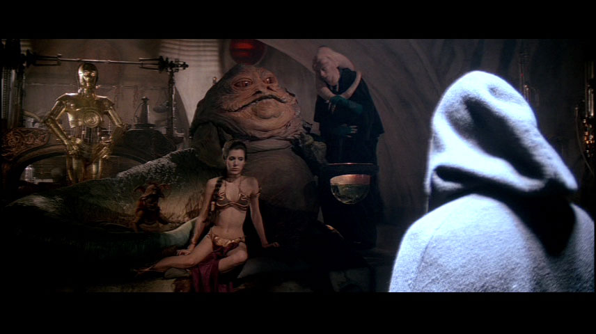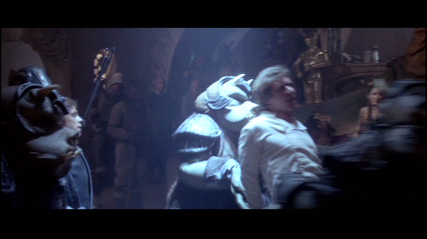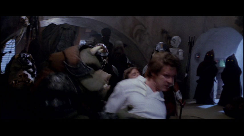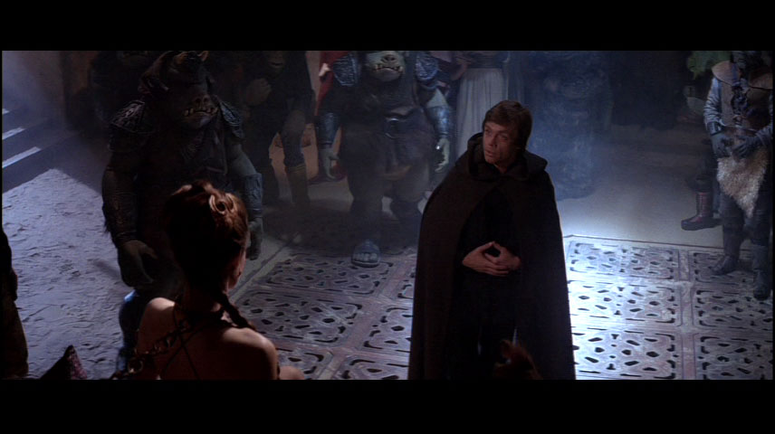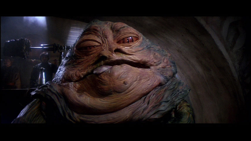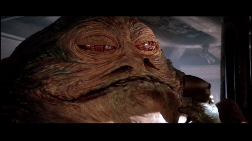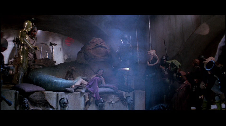 Infamous mercenary clad in Mandalorian armour moves around the throne room a great deal. At Jabba's right hand during Skywalker's arrival. At Jabba's left when Jabba' passed sentence. |