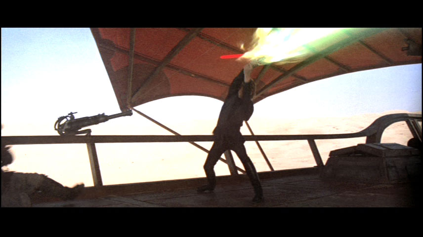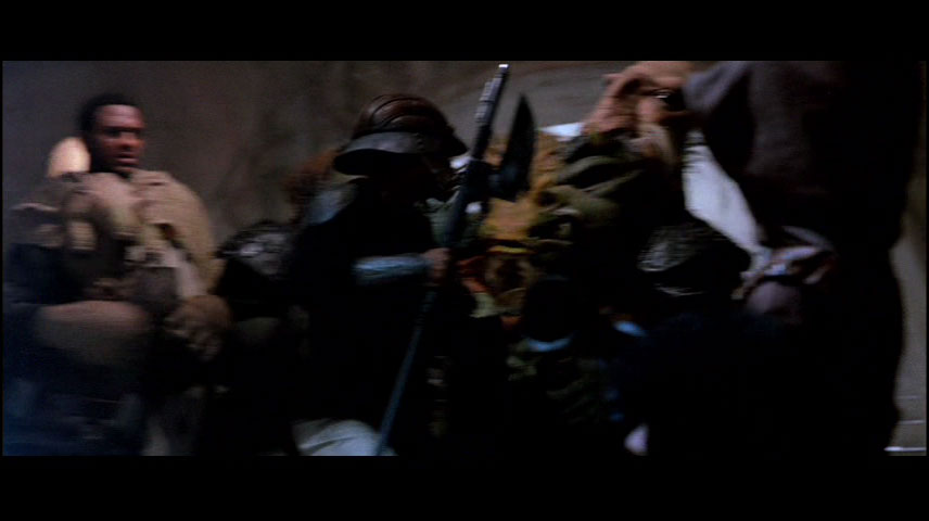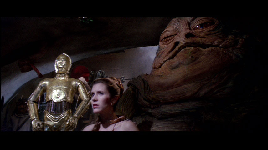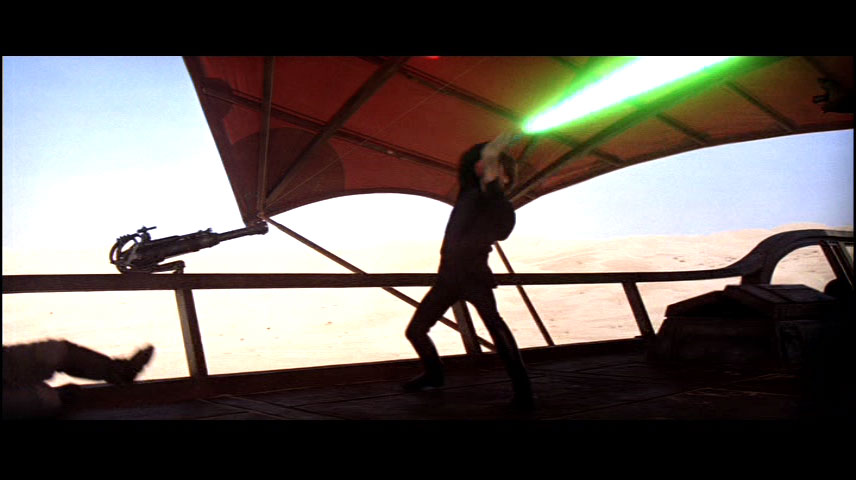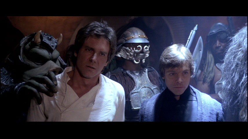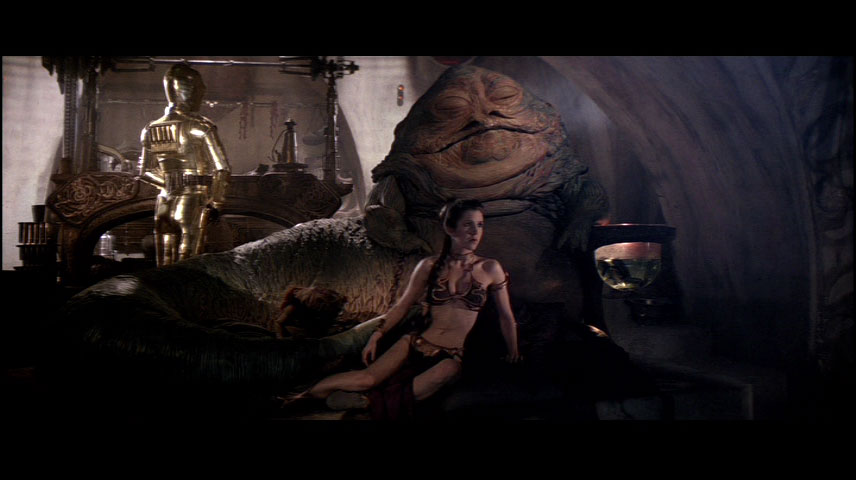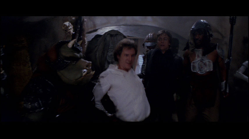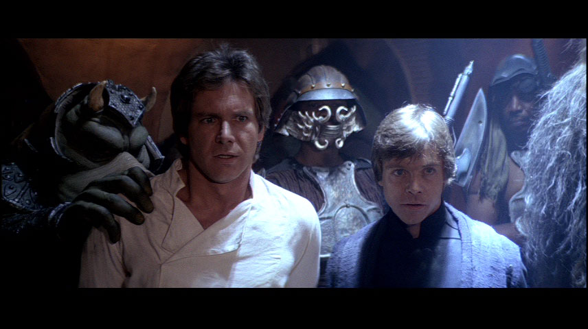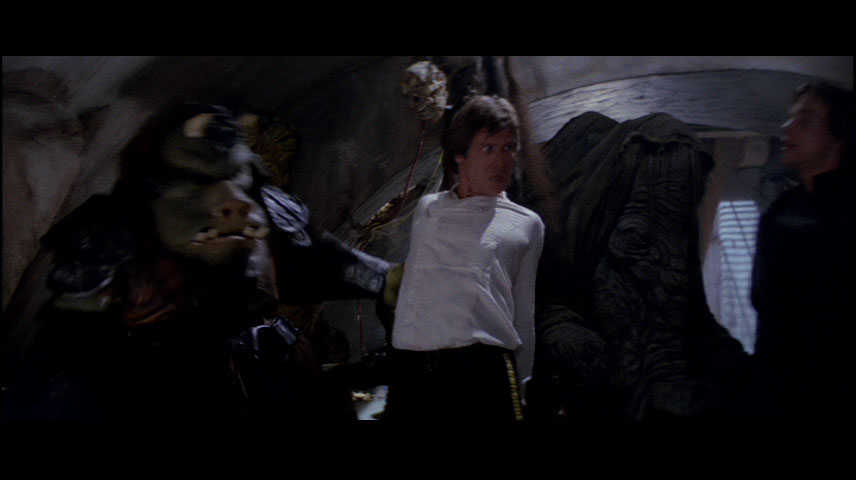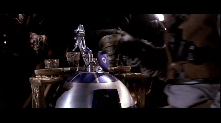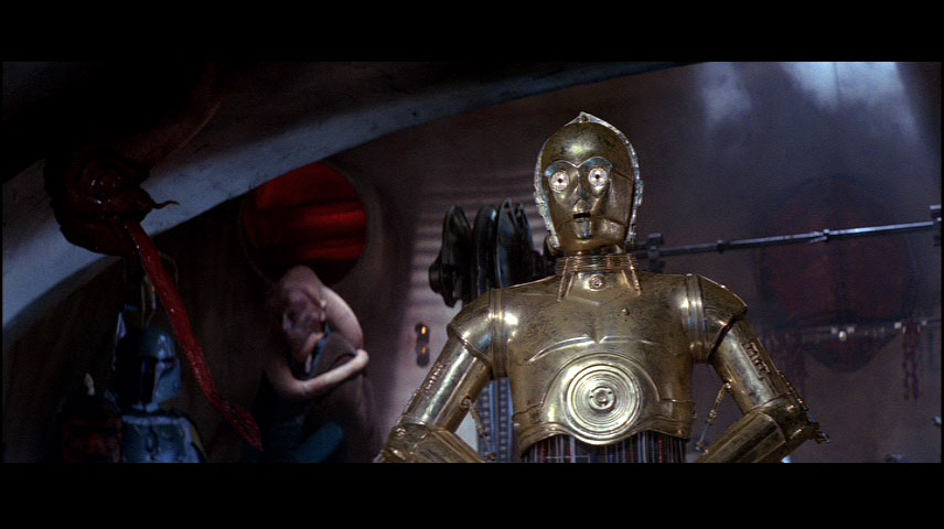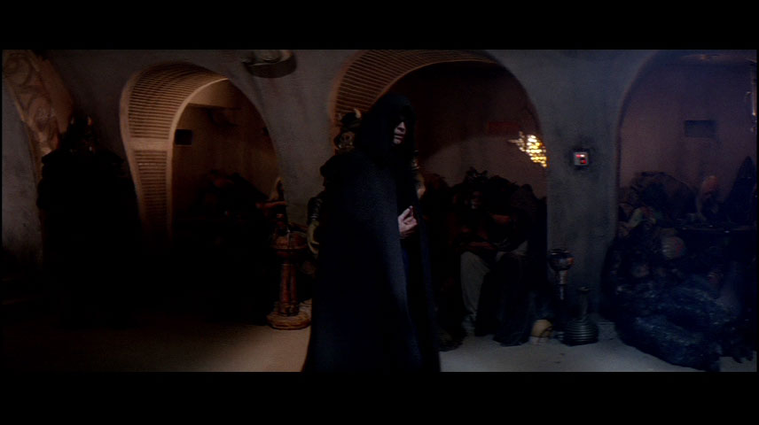 Infamous mercenary clad in Mandalorian armour moves around the throne room a great deal. At Jabba's right hand during Skywalker's arrival. At Jabba's left when Jabba' passed sentence. |