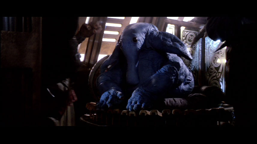 Long-tongued, sluglike creature clinging to the ceiling beyond Jabba's right arm, over the dais. |