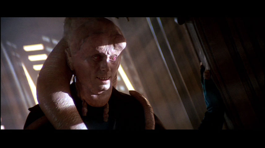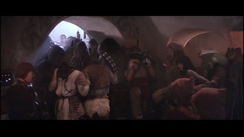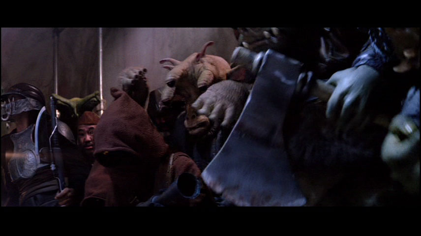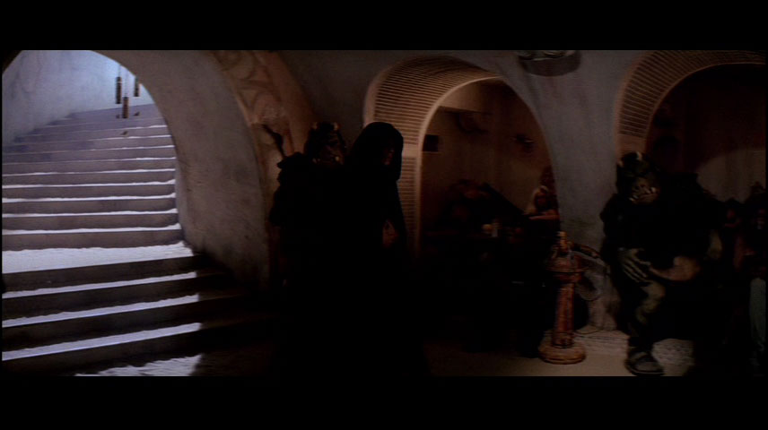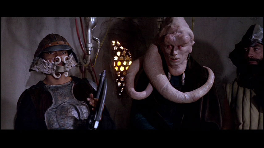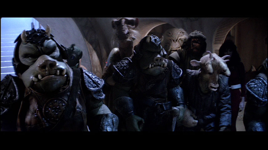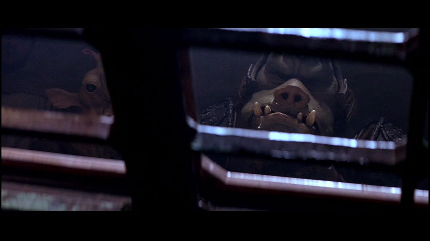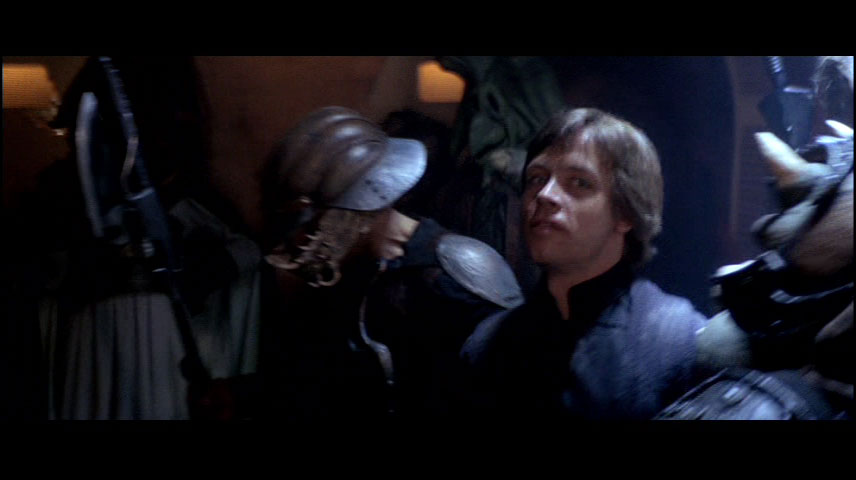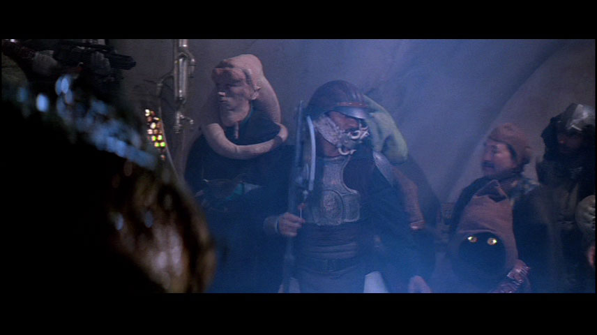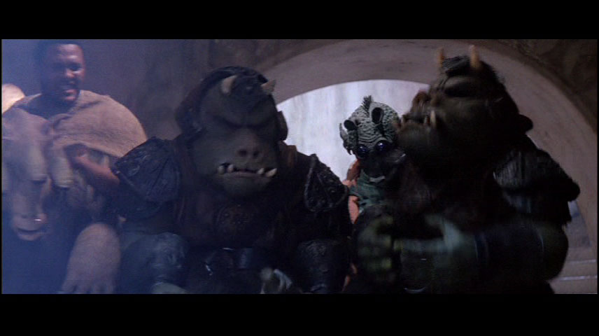 Nikto with dark top and creamy sleeves. Visible behind Ree Yees and a cordon of Gamorreans, near the main entry to the throne room when the prisoners were sentenced. |