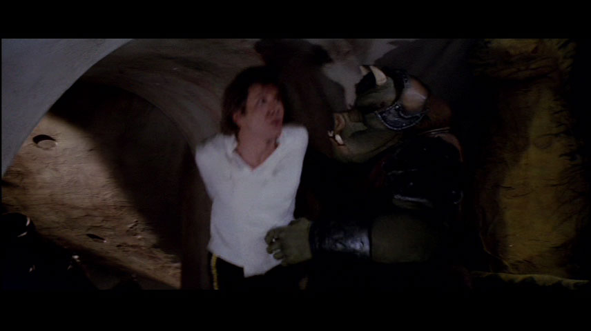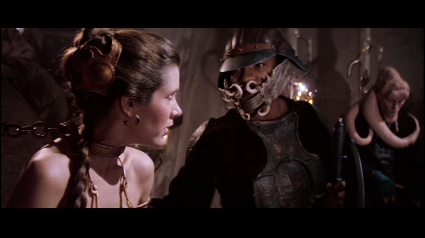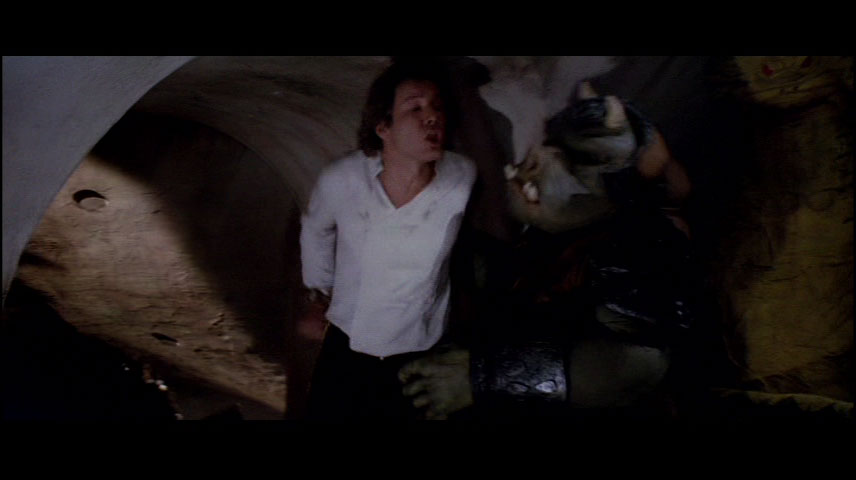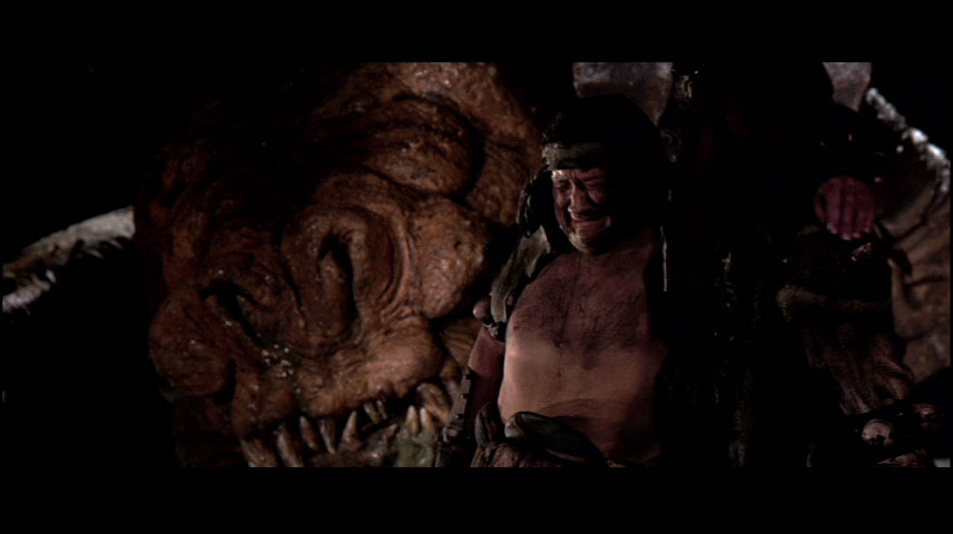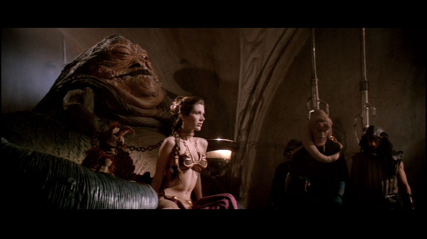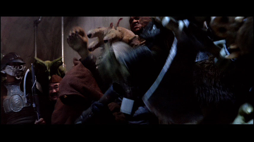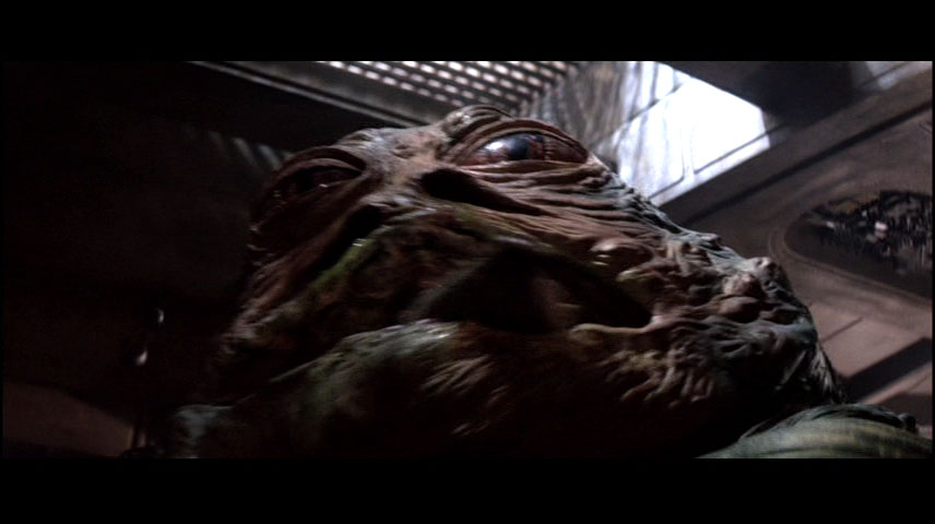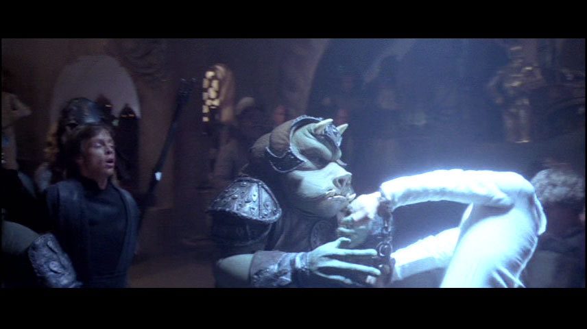 Slept entwined with Tessek, opposite Jabba's dais. Crept towards Luke Skywalker's back during the confrontation preceding the rancor fight. |