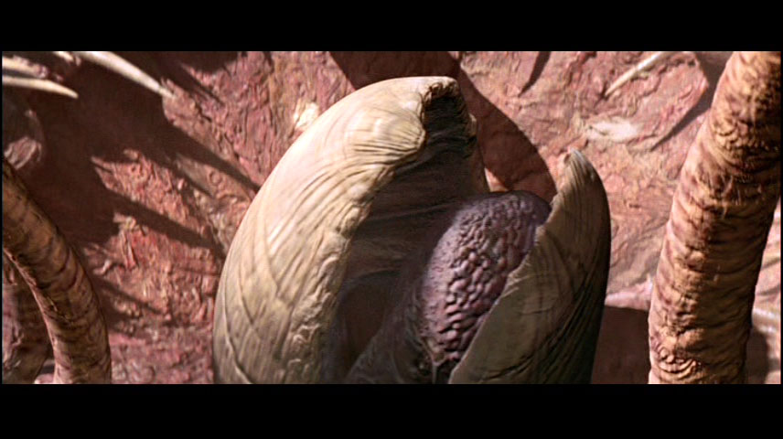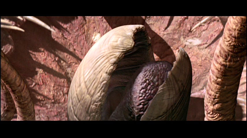 The sarlacc's horny inner beak, extruded from the mouth for feeding, is seen in close-up. The beak appears to contain a fat tongue.