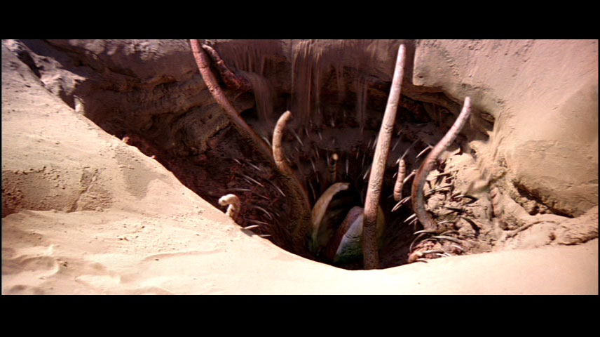 Most of the body of a sarlacc is buried beneath ground, with only the gaping, pink, mucous-lined, toothy, circular maw exposed. More than half a dozen slender tentacles sprout from the walls of the mouth; they are used to sieze prey and to remove unwanted material from the feeding cavity. During feeding a large horny beak is extruded. This is the mouth proper. When closed, the beak is nearly filled by what seems to be a fat tentacle specialised to act as a tongue.