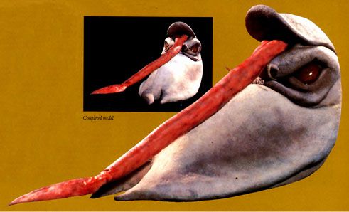 Hideous giant mollusk approximately seventy centimetres long lurking in the palace of Jabba the Hutt. Seen only once in Return of the Jedi, the fiend clung to the ceiling of the Hutt's audience chamber and attempted to lick C-3PO. The leathery body is brownish-pink and sluglike in proportion and smoothness. The face consists of a pair of dark brown milky eyes positioned for binocular vision, a pair of feelers and a broad boneless mouth. The red, fleshy, prehensile tongue extends up to a metre from the body.