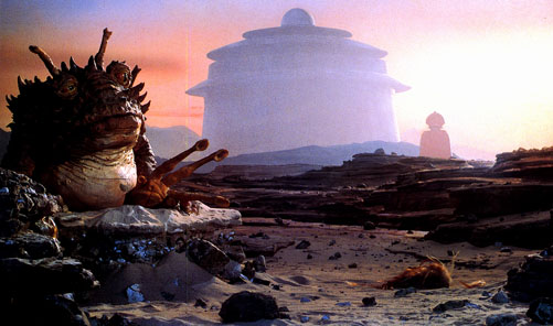 A worrt near the palace of Jabba the Hutt prepares to spring upon a smaller animal.